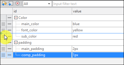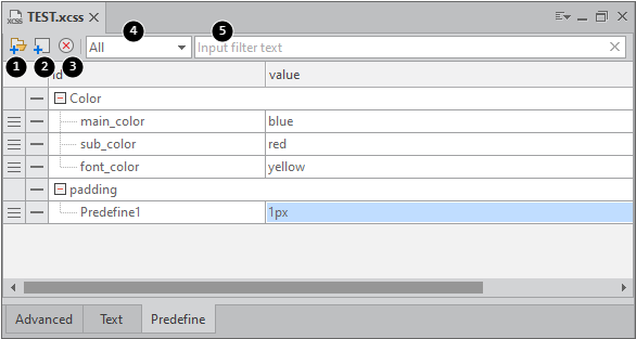 XCSS 편집 시 속성값으로 반복해서 사용하는 값을 변수처럼 미리 선언해놓고 속성값을 직접 지정하는 대신 해당 변수(id)로 지정할 수 있습니다. 속성값 수정이 필요할 때 속성값을 직접 찾아서 변경하지 않고 Predefine 항목 중 원하는 Item의 value 값만 수정하면 빠르게 속성값을 반영할 수 있습니다.