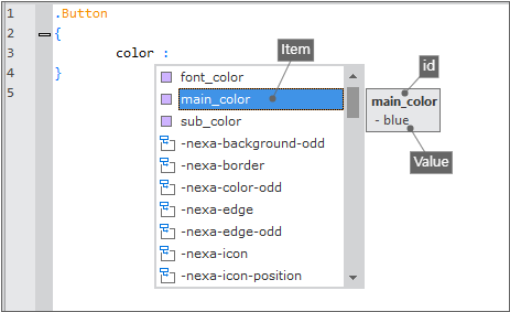 XCSS 편집 시 인텔리센스 기능을 사용해 Predefine 탭에서 선언한 Item을 확인하고 선택할 수 있습니다.
