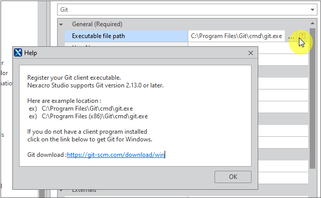 "Executable file path" 항목 오른쪽에 [?] 버튼을 클릭하면 깃 클라이언트 설치에 필요한 정보를 확인할 수 있습니다.