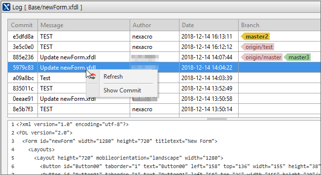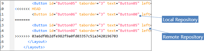 충돌이 발생한 파일은 넥사크로 스튜디오 XML 에디터로 열립니다. "HEAD" 아래 있는 코드가 Pull 명령 수행 전 Local Repository에 Commit 된 코드입니다. "=======" 아래 있는 코드는 Remote Repository에서 가져온 코드입니다. 변경된 코드를 확인하고 수정하면 충돌을 해결할 수 있습니다.