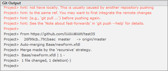 Git 기능에 대한 수행 결과를 보여주는 창입니다. 실행 중 오류가 발생한 경우에는 강조된 색상으로 표시됩니다.