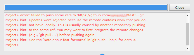 로컬 저장소와 원격 저장소의 파일이 다른 경우에는 로컬 저장소 Commit 후 Push 명령 수행 시 아래와 같은 메시지가 보여질 수 있습니다. 이런 경우에는 먼저 Pull 명령을 수행한 이후에 Push 명령을 수행합니다.