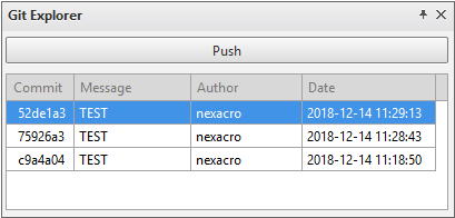 원격 저장소에 연결되어 있는 경우 로컬 저장소에 Commit 한 변경 내용을 Push 명령으로 발행할 수 있습니다. 메뉴[Git > Push] 또는 Git Explorer 창에서 [Push] 버튼을 클릭합니다.
