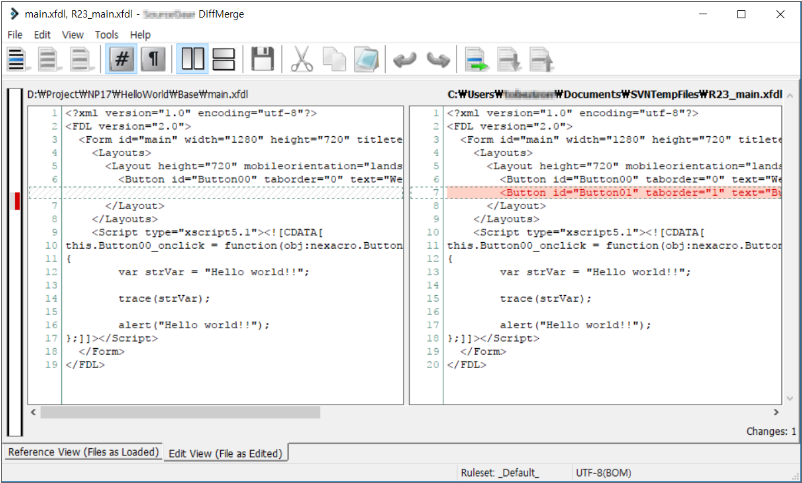 충돌이 발생한 코드가 간단한 경우에는 XML 에디터에서도 쉽게 수정할 수 있지만, 충돌이 발생한 코드가 복잡한 경우에는 외부 Merge tool을 사용해서 충돌을 해결할 수 있습니다.