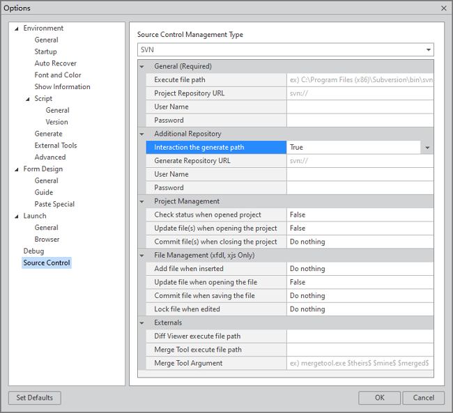 SVN Bar와 Menu는 서브버전 클라이언트를 설치한 후 넥사크로 스튜디오의 Tools > Options 창에서 Source Control 항목을 설정해야 활성화되어 사용할 수 있습니다.