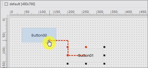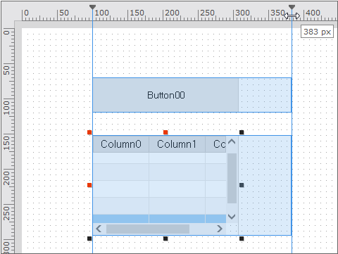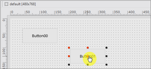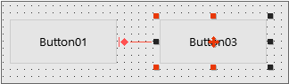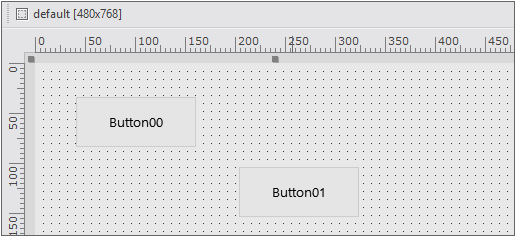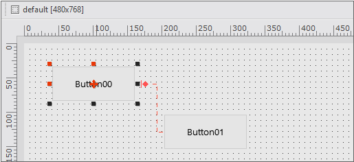 아래 그림의 경우 첫 번째 행에 배치된 Button01 컴포넌트의 left 속성값은 "183"입니다. Button00 컴포넌트의 너비와 간격을 같이 계산해야 합니다. 하지만 두 번째 행에 배치된 Button01 컴포넌트의 left 속성값은 "Button00:28"과 같은 식으로 Base가 되는 컴포넌트와 Base 컴포넌트를 기준으로 간격만 지정합니다.