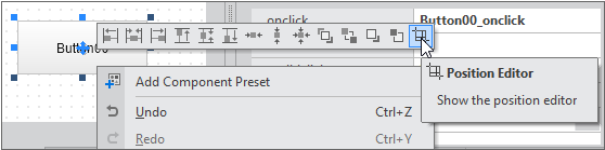 컴포넌트를 선택하고 오른쪽 마우스를 클릭한 후 미니 툴바에서 [Position Editor] 아이콘을 선택하거나 메뉴[Design > Position Editor]를 선택하고 실행할 수 있습니다.
