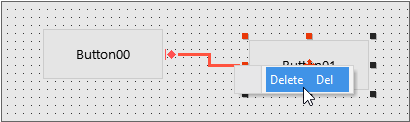 디자인창에서 연결 관계를 표시하는 선을 선택한 후 [Delete]키를 입력하거나 오른쪽 마우스 클릭 후 [Delete] 항목을 선택하면 연결 관계가 없어집니다. 컴포넌트를 선택하고 속성창에서 해당 속성값의 Base 항목을 지워도 연결 관계가 없어집니다.