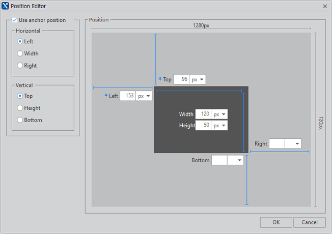 "Use anchor position" 옵션을 선택한 경우에는 원하는 항목을 고정시킨 상태에서 값을 수정할 수 있습니다. 아래 그림과 같은 경우 Left, Top 속성값이 고정된 상태이고 해당 속성값은 지울 수 없습니다.