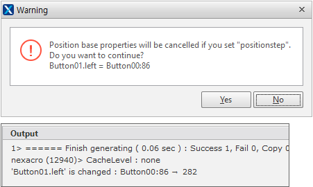 컴포넌트의 positionstep 속성값이 변경되거나 z-order가 변경되는 경우에도 연결 관계가 삭제됩니다. 연결 관계가 삭제될 대상을 경고 메시지로 보여주고 삭제된 결과는 Output 창에 표시됩니다.