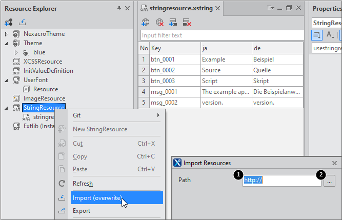 외부에서 StringResource를 가져오거나 StringResource를 생성한 후 다른 데이터로 덮어쓰고자 할 때는 Resource Explorer에서 StringResource 항목을 선택하고 컨텍스트 메뉴에서 [Import (overwrite)]를 선택합니다.