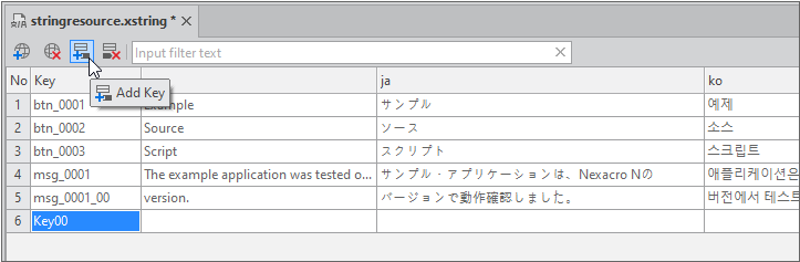 툴바에서 [Add Key] 아이콘을 클릭하면 빈 행이 추가됩니다. 추가된 행에서 Key 값을 수정하고 각 언어 칼럼에 적절한 값을 입력합니다.