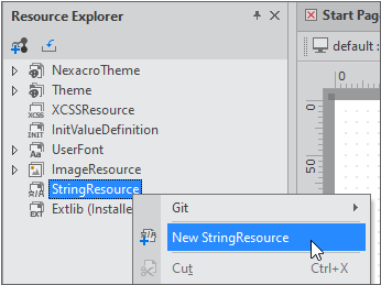 Resource Explorer 탭 내에 StringResource 항목을 선택하고 새로운 StringResource 항목을 만들 수 있습니다.