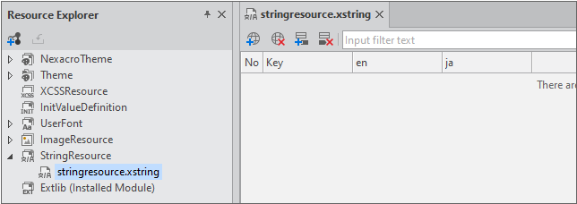 StringResource가 만들어지면 편집창이 열립니다. 시스템 로캘 추가 설정을 한 경우에는 기본(en) 칼럼과 시스템 로캘(ja) 칼럼이 추가된 상태를 확인할 수 있습니다.