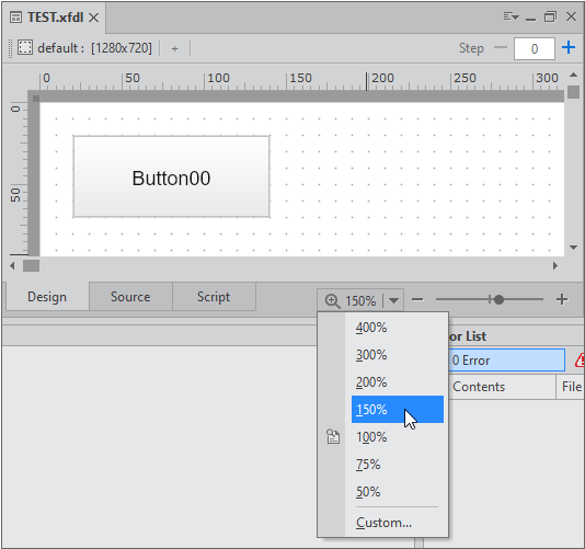 디자인 화면은 탭 위치에서 줌 기능을 지원합니다.