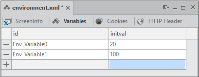 Environment는 Application Information과 별도로 개별 화면을 처리하기 위한 설정을 정의합니다. ScreenDefinition, Variables, Cookies 항목을 지정하며 별도 스크립트를 작성할 수 있습니다.