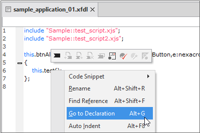 스크립트 내 include 문을 사용해 다른 스크립트를 참조하는 경우에는 해당 스크립트 파일을 바로 열어주는 기능을 제공합니다. include 문 위치에서 오른쪽 마우스를 클릭해 컨텍스트 메뉴를 실행하고 [Open Include File - XX.xjs] 항목을 선택합니다.