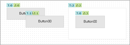 녹색 사각형 안에 표기된 것은 컴포넌트의 Z-Order를 표시합니다. Z-Order는 컴포넌트가 겹쳐있을 때 보여주는 순서를 지정합니다. 숫자가 큰 컴포넌트가 가장 위에 위치하며 사용자에게 보입니다.
