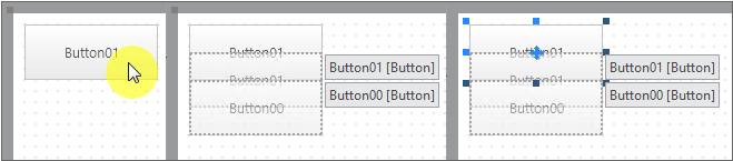 컴포넌트의 크기와 위치값이 같은 경우 겹쳐져 표시됩니다. 디자인 화면에서는 겹쳐있는 컴포넌트 위로 마우스 포인터 이동 시 겹쳐있는 컴포넌트를 펼쳐서 표시하고 원하는 컴포넌트를 클릭해서 선택할 수 있습니다.