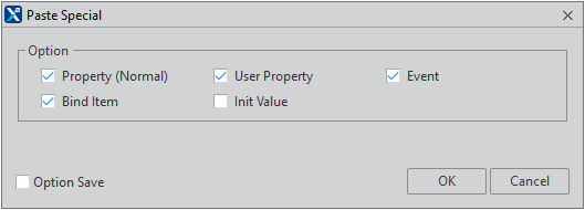 선택된 Option 정보만 적용된 상태로 컴포넌트를 붙여 넣습니다. [OK] 버튼을 클릭하기 전에 "Option Save" 항목을 체크한 경우에는 현재 선택된 Option 정보가 [Option > Form Design > Paste Special]에 반영됩니다.