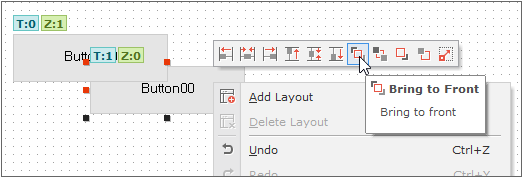 Z-Order는 Align 툴바에서 'Bring to Front', 'Send to Back', 'Bring Forward', 'Send Backward' 4가지 기능을 사용해 변경하거나 Source 탭에서 배치된 XML 코드의 순서를 바꿔 변경할 수 있습니다.