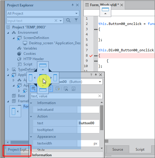기능을 제공하는 창의 배치를 변경하거나 다른 창과 겹쳐서 탭으로 표시할 수 있습니다. 또는 넥사크로 스튜디오 영역을 벗어나 별도의 윈도우로 배치할 수도 있습니다.