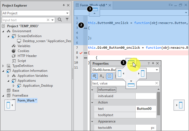 3 | 해당 창 기준이 아니라 메뉴, 툴바 영역과 상태 표시줄 영역을 제외한 전체 화면 영역에서 창을 결합할 방향을 지정합니다. 예시 그림에서 1 번을 선택했을 때는 폼 디자인 창 바로 위에 속성창을 결합하지만 3 번을 선택하면 툴바 아래에 속성창을 결합합니다. |