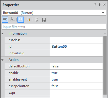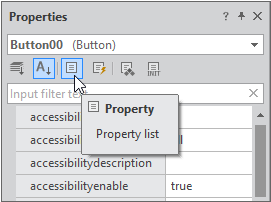 선택된 오브젝트의 속성이나 이벤트를 범주로 정렬해 편집합니다. 편집할 때는 그림과 같이 '▶'나 '▼'를 마우스로 클릭하여 범주 항목을 펼치거나 접을 수 있습니다.