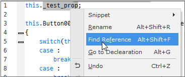 스크립트 창에서 컨텍스트 메뉴 항목 중 [Find Reference]를 선택하면 프로젝트 내에서 해당 문자열과 연관된 파일을 검색하고 사용하는 참조 위치를 표시합니다. 항목을 더블 클릭하면 해당 위치의 편집기를 엽니다.