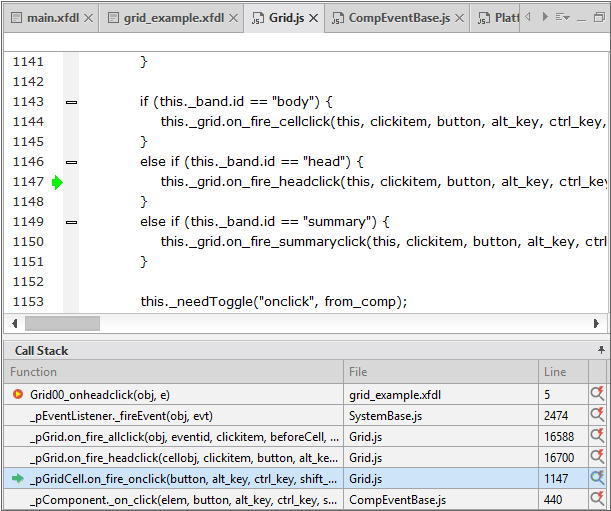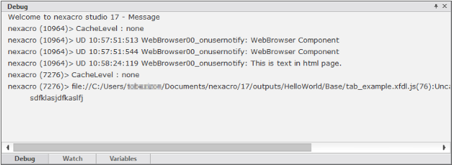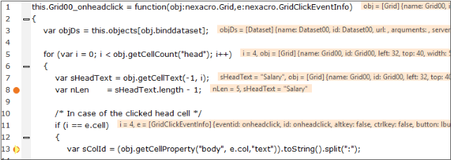 넥사크로 스튜디오에서 제공하는 디버깅 기능은 NRE에서 실행했을 때만 동작합니다. 실행환경이 웹브라우저인 경우에는 웹브라우저에서 제공하는 디버깅 기능을 사용해야 합니다.