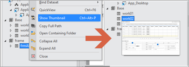 Form을 선택하고 컨텍스트 메뉴에서 [Show Thumbnail] 항목을 선택하면 디자인 화면 미리보기가 표시됩니다. 미리보기는 2초 정도 표시되고 사라집니다.