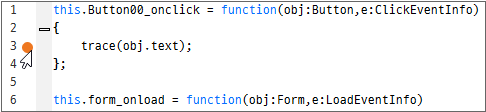 중단점을 추가하려면 스크립트 편집 창이 활성화된 상태에서 툴바의 Toggle Breakpoint 선택 시 편집 창의 커서 위치에 마커를 추가하고 Breakpoints창에 중단점 정보를 추가합니다.