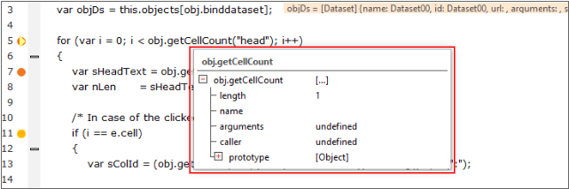 스크립트 편집기에서는 디버깅 중에 오브젝트와 변수 값을 직관적으로 확인할 수 있도록 Assist Tip과 Inline Assist Variable 기능을 제공합니다.