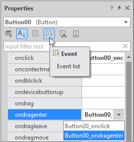 선택된 오브젝트의 이벤트를 편집하는 기능을 제공합니다. 값 입력 창을 더블 클릭하거나 콤보 아이템을 선택하여 이벤트 생성할 수 있습니다.