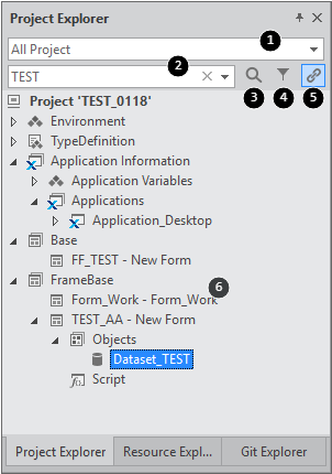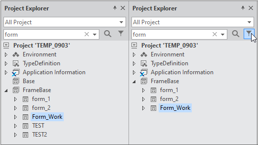프로젝트 검색과 필터 기능에서 서비스에 포함된 Form 파일을 열지 않은 상태에서는 Form 파일 이름만을 대상으로 처리되며 Form 파일을 열고 난 후에는 Form에 포함된 레이아웃이나 스크립트 관련 속성까지 포함해 처리됩니다.