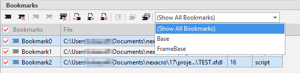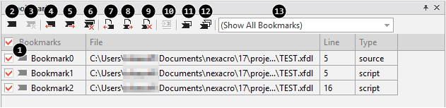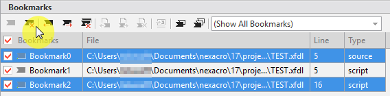 북마크를 설정, 해제하면 해당 편집 창에 바로 반영되며, 북마크 목록은 넥사크로 스튜디오 내부적으로 별도 관리하기 때문에 다른 장소에서 만든 프로젝트를 복사해 작업하는 경우 북마크까지 복사되지 않습니다.