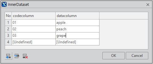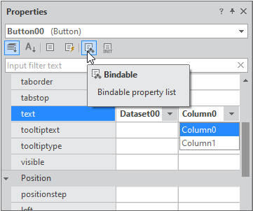 선택된 오브젝트의 속성에 Dataset을 바인딩하는 기능을 제공합니다. 첫 번째 콤보에는 Dataset의 ID를 지정하고 두 번째 콤보에는 Column ID를 지정하여 바인딩할 수 있습니다.