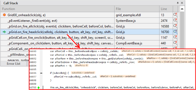 또한 적중된 중단점이 속한 함수뿐만 아니라 그와 연관된 Call Stack 상의 함수를 더블 클릭하면 스크립트 편집기로 해당 파일을 오픈하고 해당 함수가 호출되기 이전까지의 오브젝트와 변수 값을 표시해 줍니다.