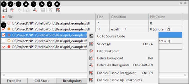 7 | Enable/Disable Breakpoint | 선택한 중단점을 활성화/비활성화 |