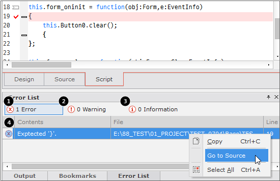 스크립트 또는 XCSS 편집 창에서 입력 시 발생한 오류, 경고, 알림 메시지를 실시간으로 표시합니다. 툴바에서 선택한 메시지 타입에 대해서 목록을 필터링할 수 있습니다.