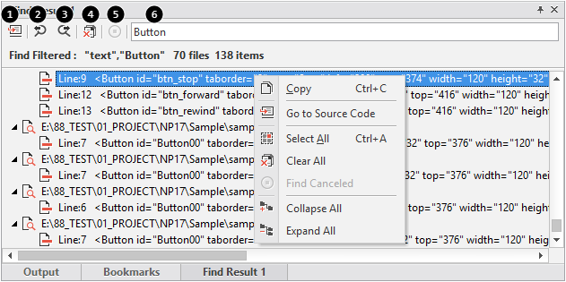 메뉴[Edit > Find in Files] 명령의 처리 결과를 표시합니다. 표시된 각 파일을 더블 클릭하면 해당 편집 창이 열리면서 해당 라인이 표시됩니다. Find in Files 검색 창에서 ‘Find result 2 window’의 체크 여부에 따라 ‘Find Result 1’ 또는 ‘Find Result 2’, 'Find Result 3'에 결과를 표시합니다.