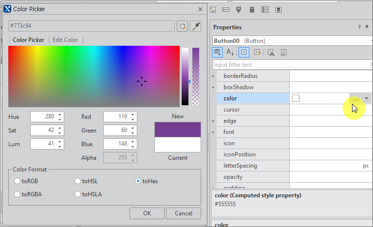 색상 관련 속성값을 선택하는 경우에 색상 목록에서 선택하거나 Color Picker를 사용할 수 있습니다.