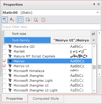 다국어를 적용하려는 경우 컴포넌트의 텍스트 관련 속성값을 StringResource에서 참조하도록 설정할 수 있습니다. 다국어 설정을 지원하는 속성 목록만 표시됩니다.