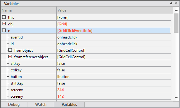 중단점이 적중한 위치에서 접근 가능한 변수나 오브젝트의 값을 표시합니다. 멤버를 포함하는 오브젝트의 경우 +/- 버튼으로 상세 내용을 펼치거나 접어서 확인할 수 있습니다. 값의 변동이 발생한 항목의 값은 적색 볼드 텍스트로 표시됩니다.
