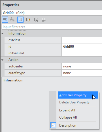 디자인 화면에 배치할 수 있는 컴포넌트(Visible Component)와 Dataset 오브젝트, Grid 컴포넌트의 하위 컨트롤(GridCellControl, CellSubCellControl), ListView 컴포넌트의 하위 컨트롤(ListViewCellControl)에 사용자 속성을 추가할 수 있습니다. 속성창에서 컨텍스트 메뉴를 열고 [Add User Property] 항목을 선택합니다.