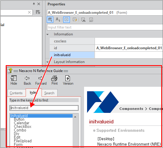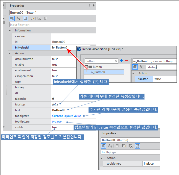 최초 앱이 실행했을 때만 지정된 속성값을 사용하고 이후에는 사용자가 입력하거나 실행 중 변경된 값을 사용해야 하는 경우가 있습니다. 그런 항목값은 Init Info 속성으로 별도 관리합니다. 속성값 중 Layout Information에 해당하는 값을 제외한 나머지 값 중에서 일부 항목만 편집할 수 있습니다.
