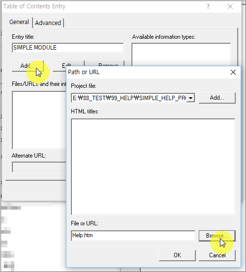 Entry title 항목에 "SIMPLE MODULE"을 입력하고 [Add] 버튼을 클릭하면 파일을 선택할 수 있는 창이 표시됩니다. [Browse] 버튼을 클릭하고 앞에서 만든 Help.htm 파일을 선택합니다.