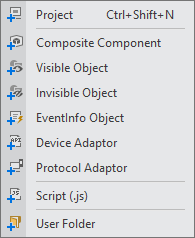New | • Project - 새로운 프로젝트 생성 • 오브젝트 생성 - 오브젝트 추가하기 항목 참고 • Script - 새로운 스크립트 생성 • User Folder - 새로운 폴더 생성 |