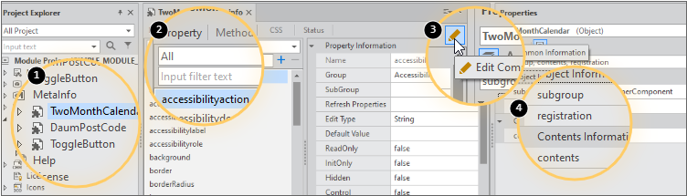 2 | Edit the properties, methods, events, CSS, and Status metainfo information of the selected object. Please refer to the Metainfo Editing (Properties, Methods, & Events). |