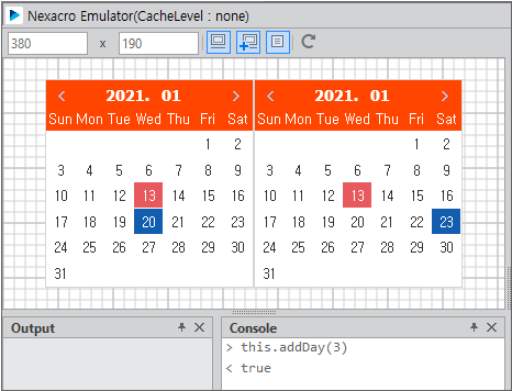 Run the emulator, select the dates from the first and second Calendar components, call the added method in the console window, and check the returned value.